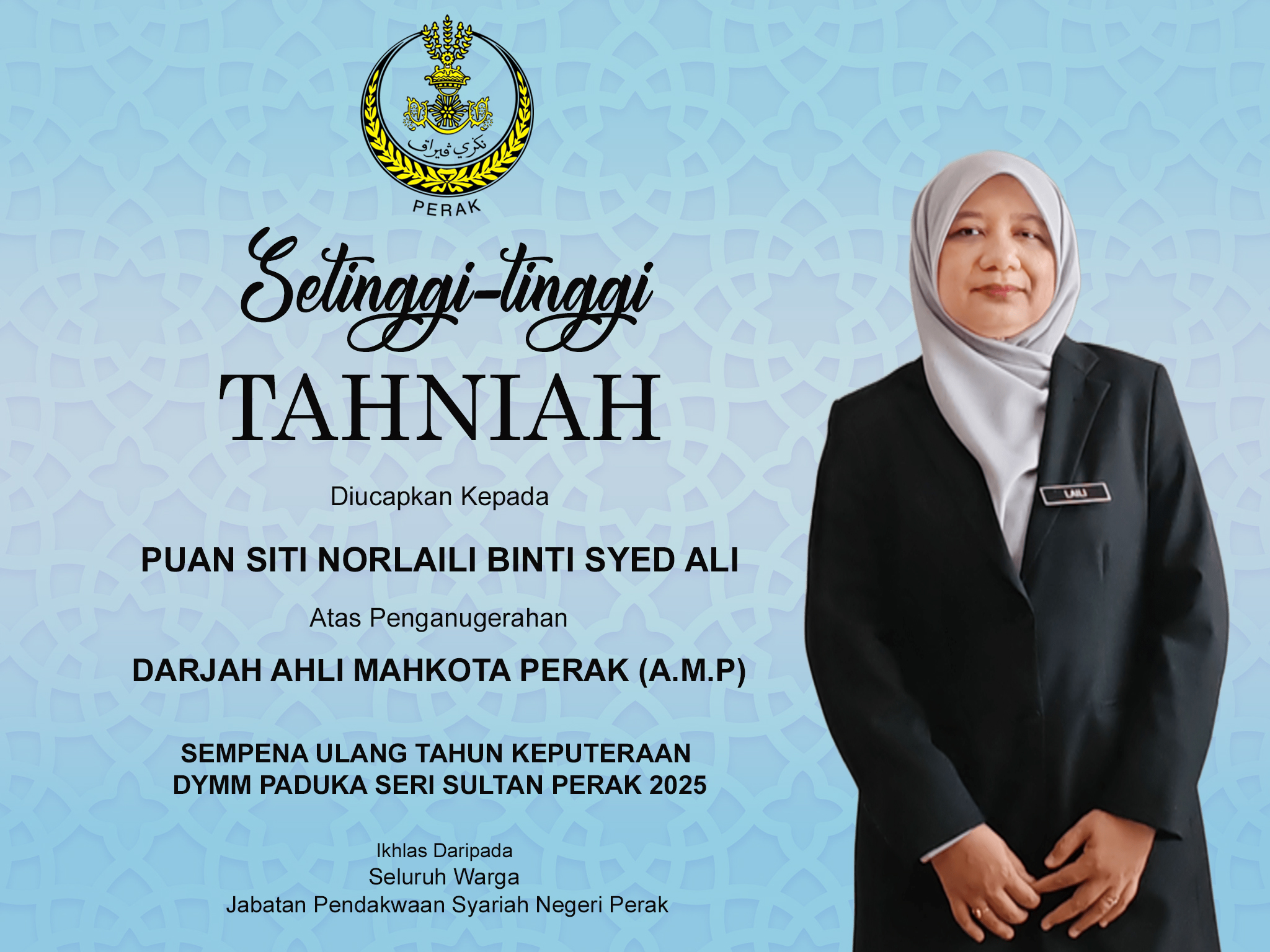 Sekalung Tahniah kepada Puan Siti Norlaili binti Syed Ali di atas Penganugerahan Darjah Ahli Mahkota Perak (A.M.P) sempena Sambutan Ulang Tahun Keputeraan Duli Yang Maha Mulia Paduka Seri Sultan Perak Darul Ridzuan tahun 2025. Ikhlas daripada seluruh warga Jabatan Pendakwaan Syariah Negeri Perak.