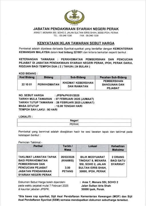 SEBUT HARGA PERKHIDMATAN PEMBERSIHAN DAN PENCUCIAN PEJABAT DI JABATAN PENDAKWAAN SYARIAH NEGERI PERAK